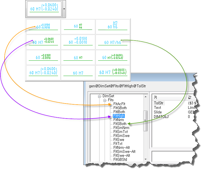 Acad/M DimSet Fits의 항목(위부터 아래로)은 맞춤 표시 리스트의 공차 표시(왼쪽부터 오른쪽으로)에 해당합니다.