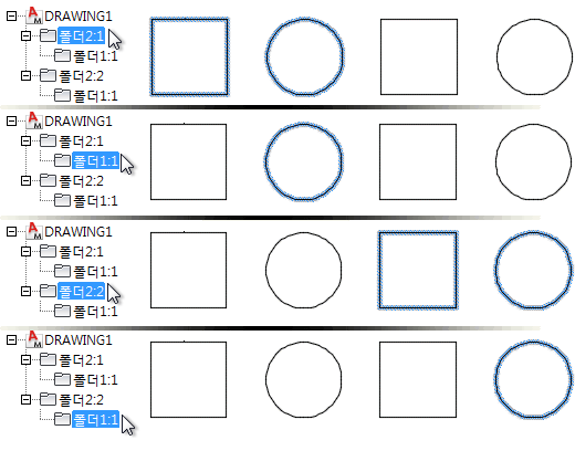 다음 그림은 두 개의 폴더가 포함되어 있는 도면을 보여줍니다. 폴더1은 폴더2 안에 내포되어 있습니다. Mechanical 검색기에 폴더2의 두 복제 폴더 2:1과 폴더 2:2가 표시됩니다. 복제 식별자는 폴더 이름 끝에 추가된 번호로 복제를 고유하게 식별합니다.