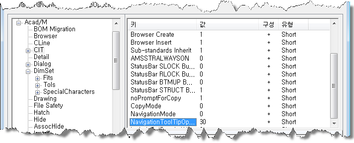 시스템 편집기의 Acad/M > CIT 분기에 있는 NavigationToolTipOpacity 키가 툴팁의 불투명도를 제어합니다. 이 키에는 불투명도 백분율 값이 있으며 100은 툴팁이 완전히 불투명하고 0은 완전히 보이지 않음을 의미합니다.