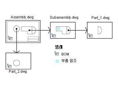 일반적인 부품/부분조립품 도면에는 해당 부품/부분조립품의 뷰가 두 개 이상 포함됩니다. 따라서 부품/부분조립품 도면을 외부 참조로 조립품 도면에 부착할 수 없으며, X-부착 작업 흐름의 효율적인 활용이 제한됩니다. 이러한 시나리오에서는 BOM 부착 워크플로우를 사용할 수 있습니다.