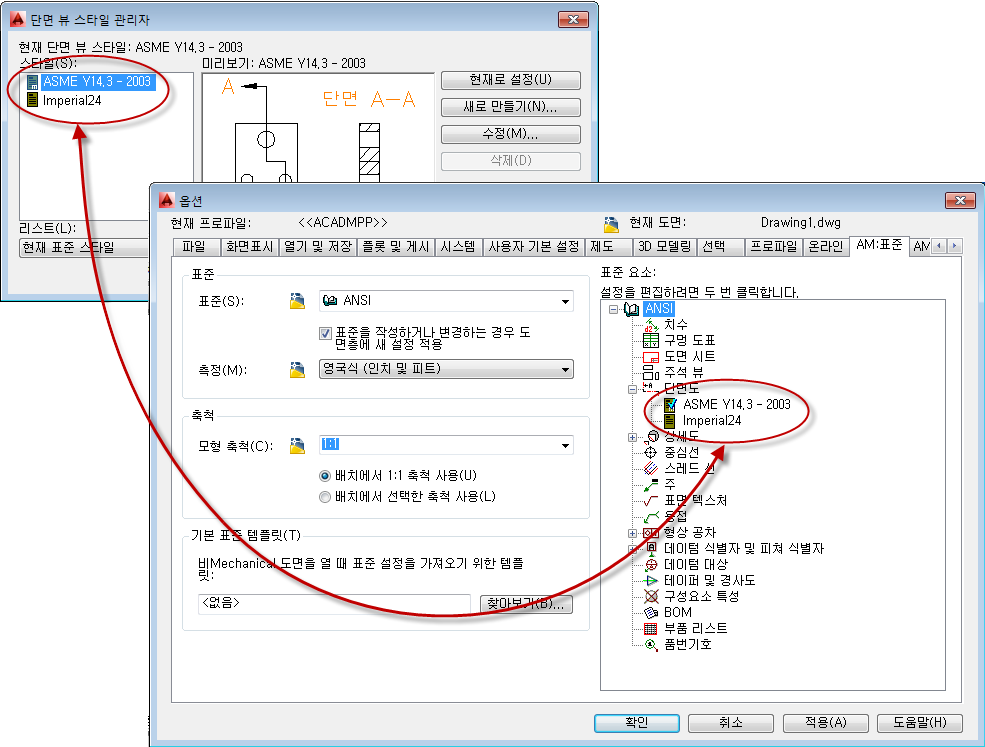 AutoCAD Mechanical toolset 객체의 모양을 제어하는 설정은 제도 표준이라고 하는 명명된 설정 집합에 저장됩니다. 단면도 스타일은 제도 표준으로 저장되며 제도 표준의 리비전으로 처리됩니다.