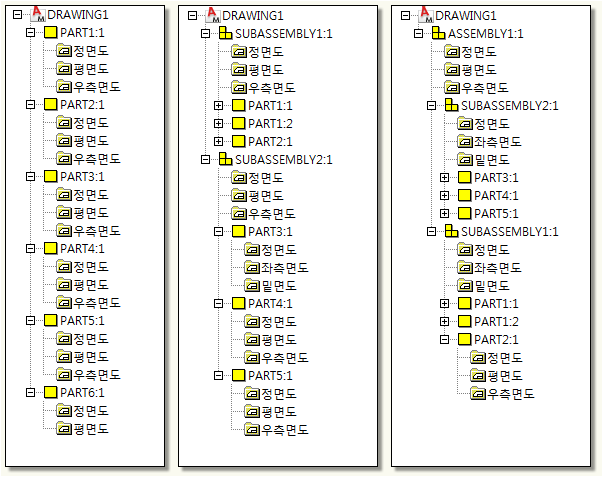 형상을 구성요소로 그룹화하는 것은 AutoCAD Mechanical toolset에서 새로운 개념이 아닙니다. Mechanical 구조가 도입되기 전에는 형상을 구성하는 데 도면층 그룹과 블록이라는 두 가지 방법을 널리 사용했습니다.