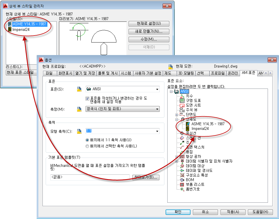 각 상세도 스타일은 제도 표준의 리비전으로 간주됩니다. AutoCAD Mechanical toolset 상세도 스타일은