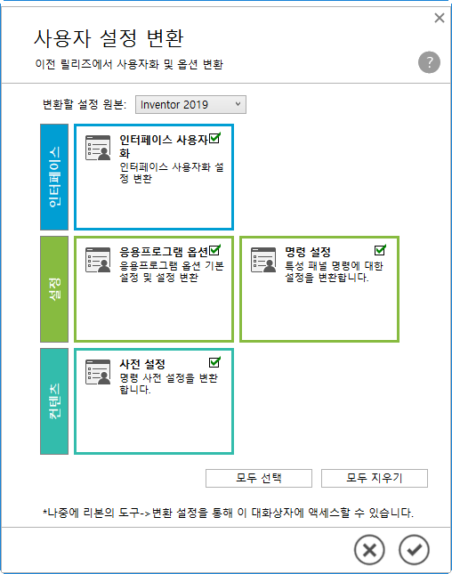 이전에 이전 버전의 Inventor(Inventor 2018 이상)를 설치한 경우 Inventor를 시작할 때 사용자 설정 변환 대화상자가 표시됩니다.