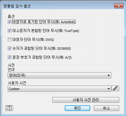 - 기본 사전으로 사용할 언어별 사전을 선택합니다. 이러한 사전은 Inventor와 함께 설치됩니다. 이 사전은 사용자 사전과 연결해 사용됩니다.