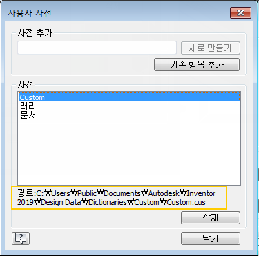 주: 기본 및 새로 작성된 사용자 사전의 기본 위치는 설계 데이터 폴더입니다.