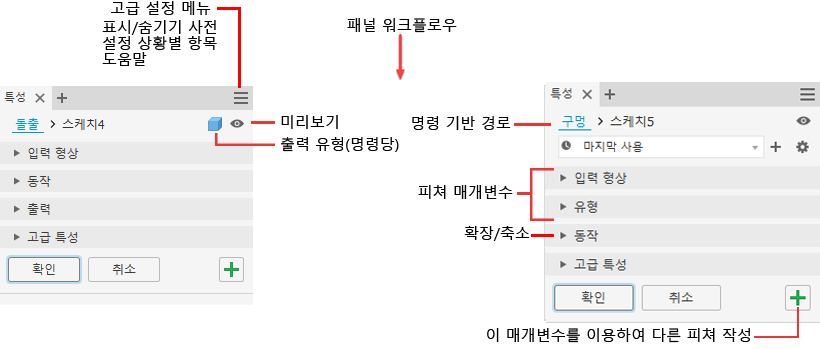 특성 패널은 피쳐를 작성 및 편집하는 데 사용하는 매개변수에 대해 상황별 액세스를 제공합니다.