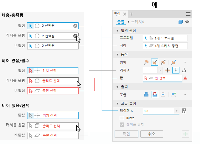 중요사항: 피쳐 미리보기 중에 스케치 환경에 들어가지 않고도 표시되는 스케치 치수를 편집할 수 있습니다.