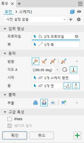 다음 단계에 대해서는 아래의 특성 패널을 사용하여 회전 피쳐 정의를 참고하십시오.