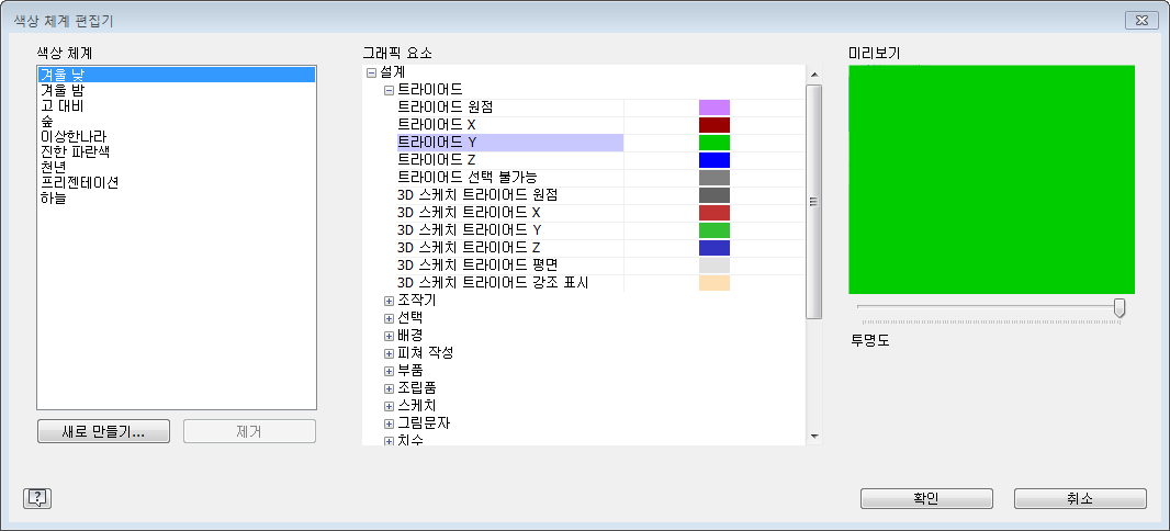 색상 체계 편집기를 사용하여 Inventor에서 사용되는 그래픽 요소의 색상 체계를 사용자화합니다.