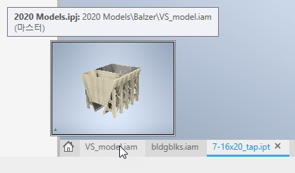 Inventor 그래픽 창 맨 아래에서 파일 이름 위에 커서를 일시정지하면 툴팁에 다음과 같이 썸네일 이미지와 문서 정보가 표시됩니다.