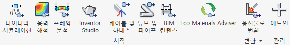 주: 다이나믹 시뮬레이션 및 응력 해석은 Autodesk Simulation 제품과 Autodesk Inventor Professional에서 모두 사용할 수 있습니다. 케이블 및 하네스, 튜브 및 파이프는 Autodesk Inventor Professional에서만 사용할 수 있습니다.