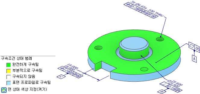Tolerance Advisor에서는 완전히 구속된 모형 작성 과정을 안내합니다. 공차 피쳐를 작성할 때 Tolerance Advisor의 검색기 창에는 잠재적 문제에 대한 정보 메시지 또는 경고가 표시됩니다. 면 상태 색상을 사용으로 설정하여 모형 면의 구속조건 상태를 확인합니다.