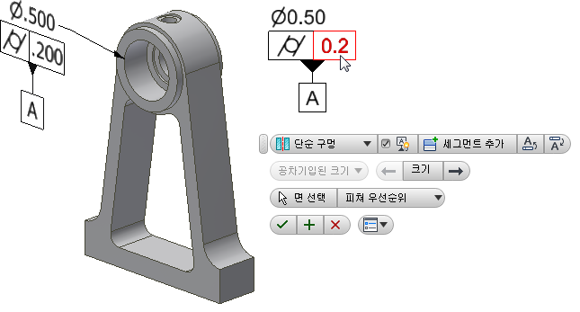 공차 주석의 대화식 미리보기가 미니 도구막대에 부착됩니다. 미니 도구막대에는 형상 또는 피쳐 유형을 선택하거나, 데이텀 식별자를 부착하거나, 형상 공차에 행을 추가하기 위한 옵션이 포함되어 있습니다. 선택한 형상이나 피쳐에 적합한 옵션이 리스트 상자에 표시됩니다.