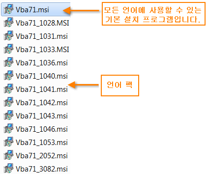 - Vba71.msi는 모든 언어에 사용할 수 있는 기본 설치 프로그램입니다. 다른 설치 프로그램은 언어 팩입니다. 해당 언어에 적합한 언어 팩을 식별하려면 다음을 참조하십시오. https://msdn.microsoft.com/en-us/library/ms912047(v=winembedded.10).aspx 해당되는 경우 적합한 설치 프로그램을 마우스 오른쪽 버튼으로 클릭하고 설치를 선택하십시오.