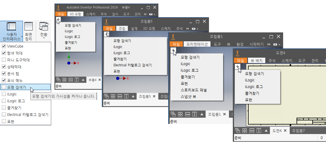 전환 드롭다운 리스트로 이동하여 모형 검색기 가시성도 변경할 수 있습니다.