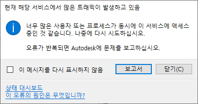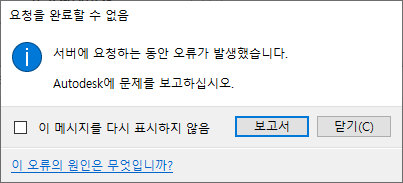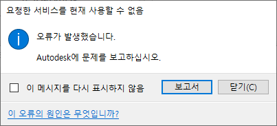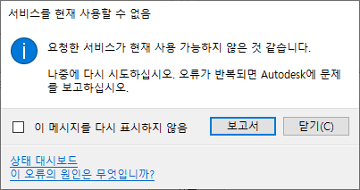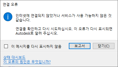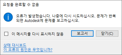 인터넷에 연결되어 있는데도 이 오류가 계속 표시되면 상태 대시보드 링크를 클릭하고 서비스의 상태를 확인하십시오. 상태 대시보드에서 서비스가 예상대로 작동하는 것으로 표시되는데도 이 메시지가 계속 표시되면 Autodesk 제품 지원에 이 문제를 보고하십시오. |
