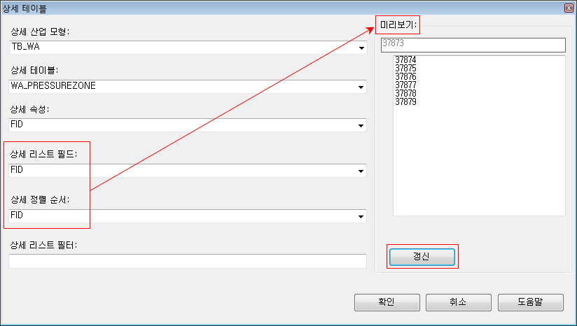 * DetailTable: 미리보기 창에 상세 리스트가 표시됩니다. 정의에 원하는 결과가 있는지 여부를 확인하려면 갱신을 클릭합니다.