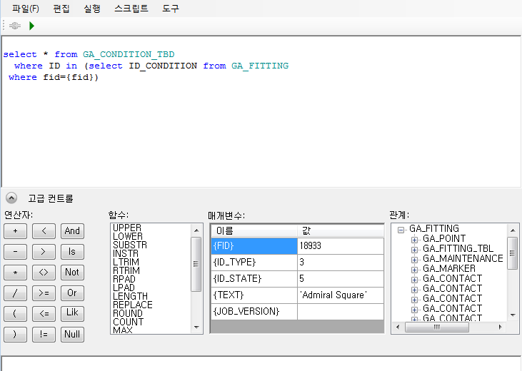 가스 데이터베이스 스키마에서 GA_FITTING 피쳐 클래스는 GA_CONDITION_TBD 피쳐 클래스와 관련됩니다. CONDITION을 조회하여 양식에 표시합니다.