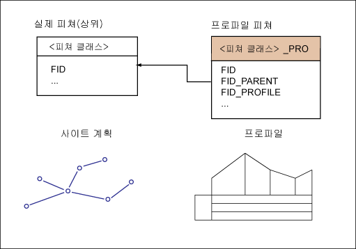 실제 피쳐(상위)(예: 맨홀 뚜껑). 실제 각 피쳐는 프로파일 피쳐와 일치하며, 실제 피쳐는 일반적으로 전역 참조 시스템에 표시되는 프로파일 객체입니다. 프로파일 피쳐 클래스는 FID_PARENT 속성에서 실제 피쳐와의 관계를 저장합니다.