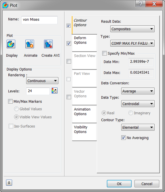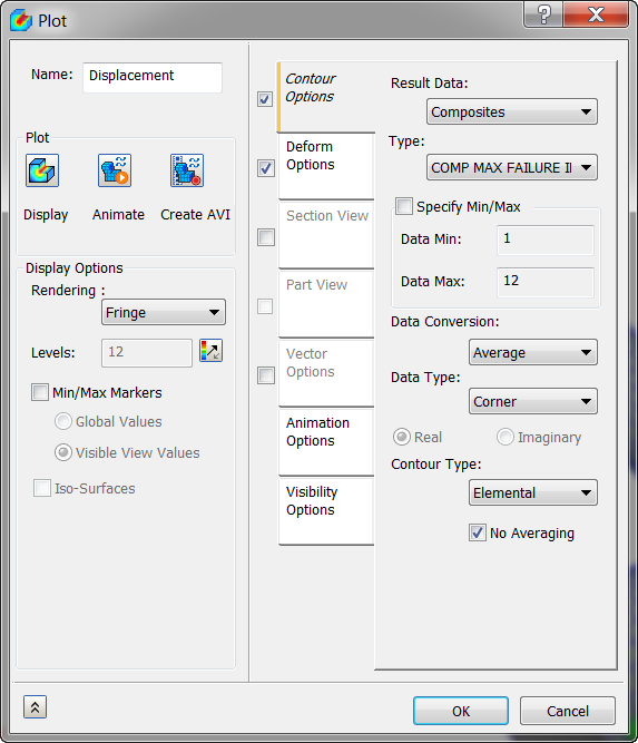 - 윤곽선 옵션 탭에서 결과 데이터로 복합재를 선택하고 유형에서 COMP MAX PLY FAILURE INDEX를 선택합니다. 변형 옵션 및 윤곽선 옵션이 선택되었는지 확인합니다.