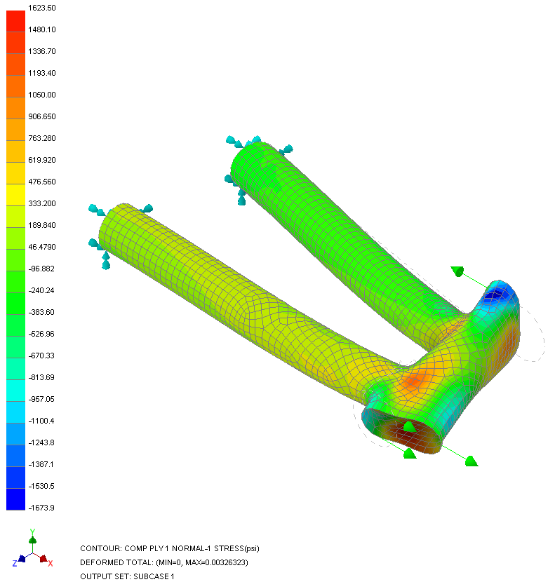 COMP PLY 1 NORMAL-1 STRESS는 플라이 1의 섬유 방향을 따르는 응력입니다. COMP PLY 1 NORMAL-2 STRESS는 플라이 1의 횡단 섬유 방향의 응력입니다.