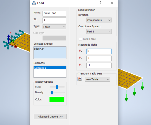 - 하중 대화상자에서 이름을 펄스 하중로 변경합니다. 구속된 모서리에서 빔의 반대쪽 끝에 있는 짧은 모서리를 선택합니다.