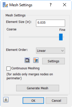 - 요소 크기를 0.035로, 요소 순서를 선형으로 설정하고 연속 메쉬를 선택 취소한 다음 확인을 클릭하여 메쉬를 생성합니다.