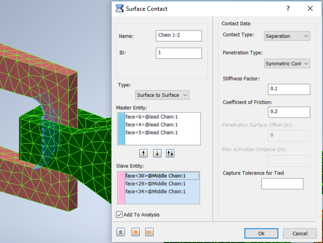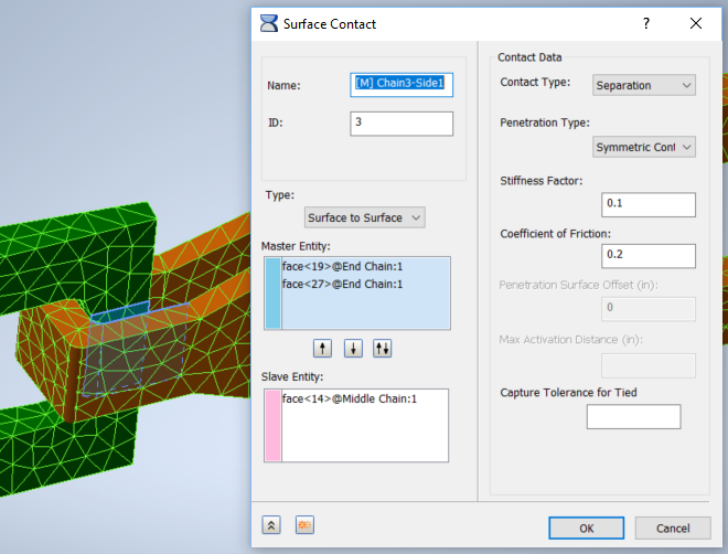 - 중간 체인과 끝 체인 사이에 유사한 접촉 세트를 작성합니다. 마스터 도면요소는 중간 체인 후면에 있는 3개의 내부 면이고, 슬레이브 도면요소는 끝 체인 전면에 있는 3개의 내부 면입니다.