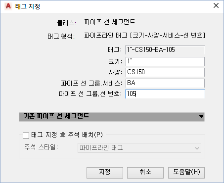 선택한 파이프가 연결되지 않은 경우에는 특성 팔레트에서 선 번호 태그 리스트를 설정할 수 없습니다.