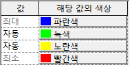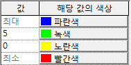 새로운 값-색상 쌍을 기본 최대 및 최소 세트에 추가할 때 자동으로 지정되는 색상은 해당 색상 위와 아래 색상 사이의 중간(RGB 형식의 선형)입니다. 자동 값에 해당하는 정확한 숫자는 다음 표에 표시된 해석 결과에 따라 다릅니다.