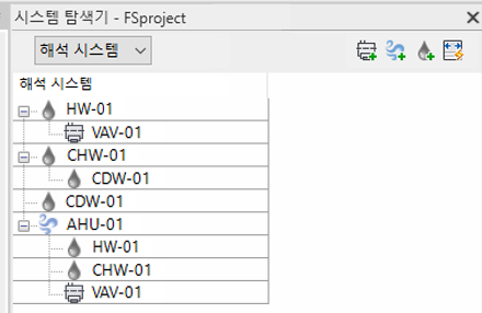 시스템 탐색기의 트리는 해석 시스템 및 구역 장비의 계층 구조를 표시합니다. 물 순환 및 공조 시스템은 상단 레벨에 표시되며, 연관된 물 순환 및 구역 장비가 그 아래에 표시됩니다.