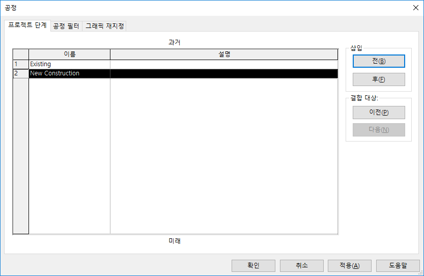 상 대화상자가 열리고 프로젝트 상 탭이 표시됩니다. 기본적으로 각 프로젝트에는 기존 시공 및 새 시공이라는 상이 있습니다.