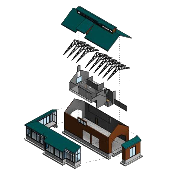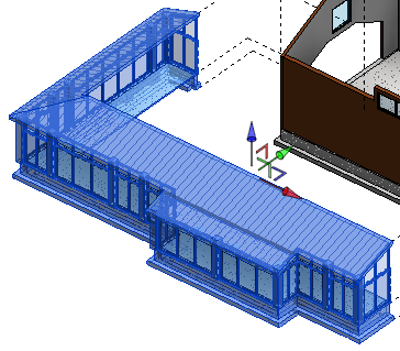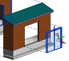 변위 세트는 하나 또는 여러 요소로 구성될 수 있고 한 세트의 끌기 컨트롤을 사용하여 뷰에 배치합니다. 다음 이미지의 변위 세트에는 여러 요소(구조 기초, 기본 지붕, 커튼월: 점두, 그리드 및 시스템 패널: 유리 패널)가 포함되어 있습니다.