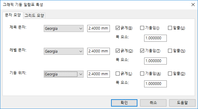 그래픽 기둥 일람표에서 문자 형식을 조정할 수 있습니다. 특성 팔레트의 문자 섹션에서 문자 모양 편집 버튼을 클릭합니다.