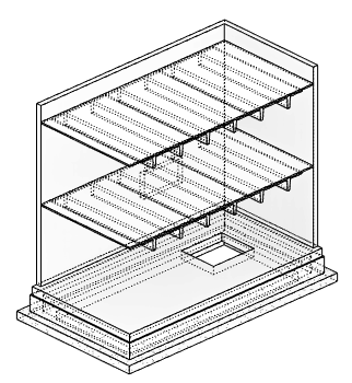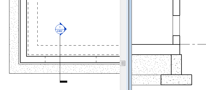 예를 들어, 오른쪽의 단면 뷰는 왼쪽에 있는 평면 뷰의 절단 기준면 아래에 발생하는 벽 개구부를 나타냅니다. 평면 뷰에서 벽 개구부를 표시하려면 은선 표시 매개변수를 모두로 설정합니다.
