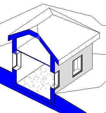 다음 이미지에서는 낮음 상세 수준에서 구획 상자에 의해 절단된 동일한 3D 뷰를 보여줍니다. 여기서 거친 Poche 재료는 파랑 솔리드로 정의되어 있습니다. 따라서 모든 절단 요소가 파랑으로 표시됩니다.
