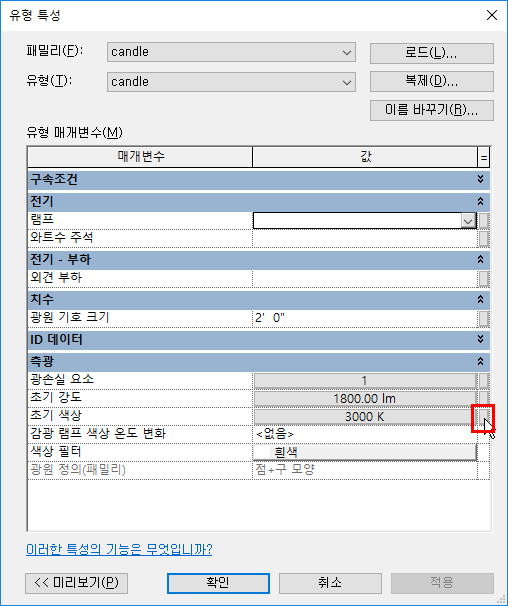 - 패밀리 카테고리 및 매개변수 대화상자의 패밀리 매개변수에서 광원을 선택합니다.