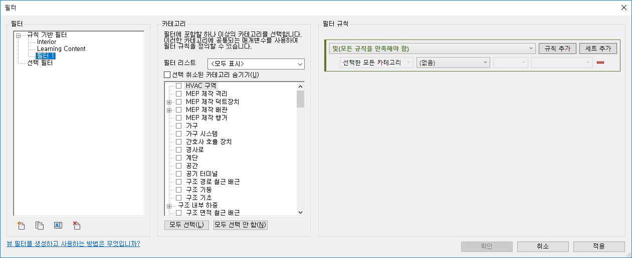 필터를 작성한 후, 하나 이상의 뷰에 적용하여 필터로 식별한 요소의 가시성 및 그래픽 화면표시를 변경합니다.