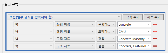AND(유형 이름에 "콘크리트" 포함 OR 유형 이름에 "CMU" 포함 OR 구조 재료 = "콘크리트 석조 단위" OR 구조 재료 = "콘크리트, 현장타설 회색")