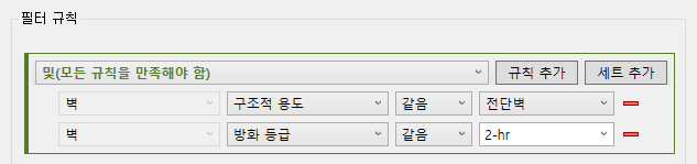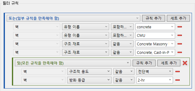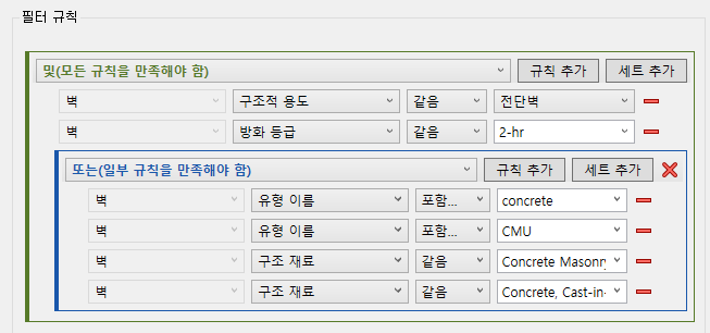 이 경우, 모델에서 콘크리트로 되어 있고 2시간 방화 등급이 있는 모든 전단 벽을 식별하려면, 다음과 같이 AND 규칙 세트로 시작하고 그 안에 OR 규칙 세트를 내포해야 합니다.