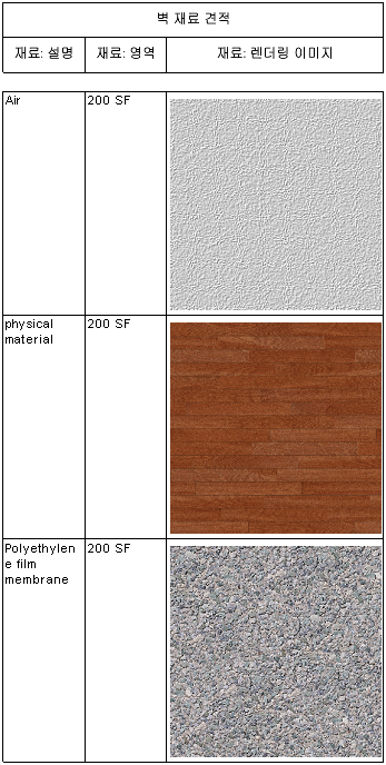 벽 재료 견적 일람표를 작성하고 재료: 렌더링 이미지 필드를 포함합니다.