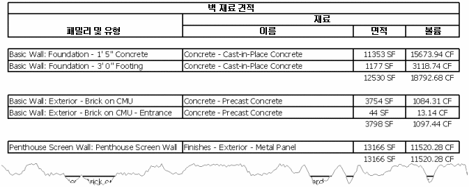 재료 견적 일람표에서는 Revit 패밀리의 하위 구성요소 또는 재료를 나열합니다. 재료 견적 일람표는 다른 일람표 뷰의 모든 기능과 특징을 갖고 있지만, 구성요소의 조합에 대해 더 자세한 정보를 표시할 수 있습니다. Revit 내에서 구성요소에 배치된 모든 재료는 일람표에 작성할 수 있습니다.