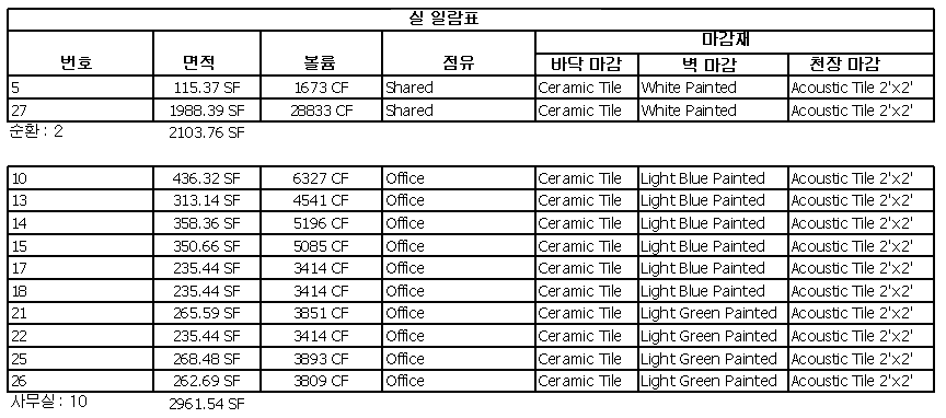 모든 일람표는 모델 수정 시 자동으로 업데이트됩니다. 예를 들어 벽을 이동하면 따라서 룸 일람표에서 정사각형 피트 단위가 업데이트됩니다.
