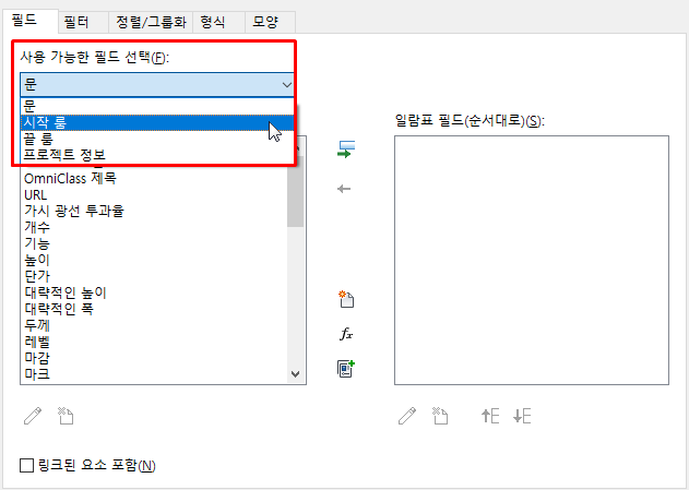 - 필드 탭의 사용 가능한 필드 선택 드롭다운에서 시작 룸이나 끝 룸을 선택합니다.
