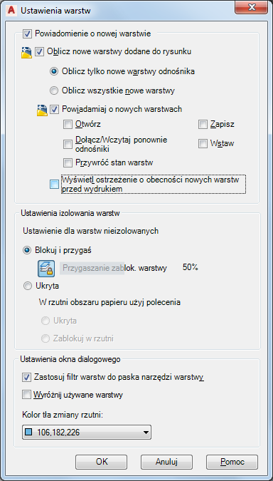 - Aby ustawić powiadamianie o nowych warstwach na rysunku, wybierz polecenie Wyznacz nowe warstwy dodane do rysunku.