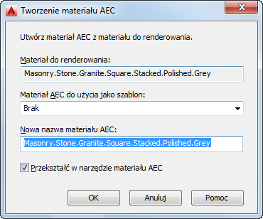 - Sprawdź, czy opcja Przekształć na narzędzie materiału AEC jest zaznaczona.