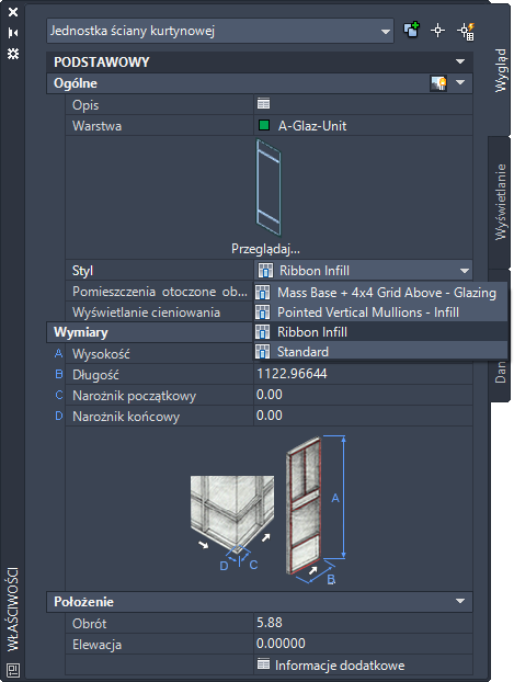Procedura umożliwia wybranie innego stylu jednostki ściany kurtynowej.