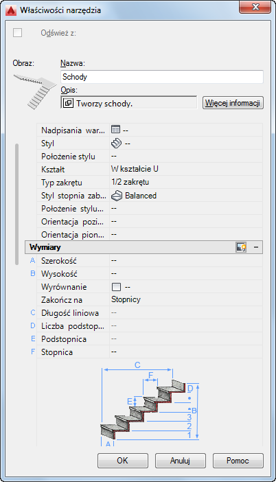 Tworząc narzędzie stylu schodów, należy wziąć pod uwagę wstępne ustawienie następujących właściwości: