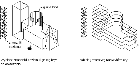 Ta procedura służy do dołączania elementów bryłowych lub grup brył do poziomu w celu utworzenia obrysu kondygnacji budynku. Można zablokować warstwę (lub warstwy) zawierające elementy bryłowe i grupy brył, aby wyświetlić wyłącznie poziomy.